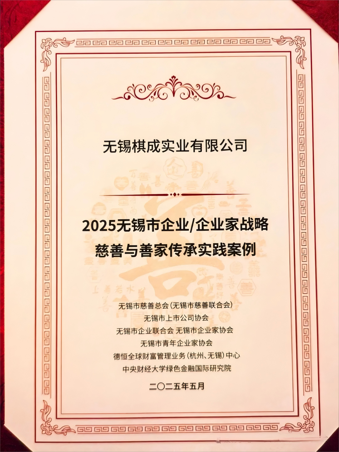 2025年5月25日,2025年无锡市企业慈善实践案例评选结果公布,无锡棋成实业有限公司作为无锡安石公益基金会理事长单位,凭借其在教育公益领域的扎实工作,入选“2025无锡市企业/企业家战略慈善与善家传承实践案例”。该评选由无锡市慈善总会、市企业联合会等多家单位共同组织,旨在表彰积极履行社会责任、创新慈善模式的优秀企业。