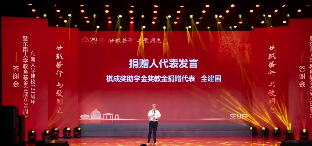 2025年6月6日,无锡安石公益基金会主要发起人、东南大学化学化工学院1999届校友 全建国先生 作为杰出捐赠人代表受邀出席东南大学建校123周年暨教育基金会成立20周年盛典,并因其长期支持母校教育事业的善举受到特别表彰。次日,东南大学化学化工学院为无锡安石公益基金会主要发起人、杰出校友全建国先生及其企业无锡棋成实业有限公司 特别举办 “棋成奖助学金、棋成奖教金”专属颁奖仪式。这是学院对全建国先生长期支持教育事业的崇高敬意,也是对其慈善精神的高度认可。