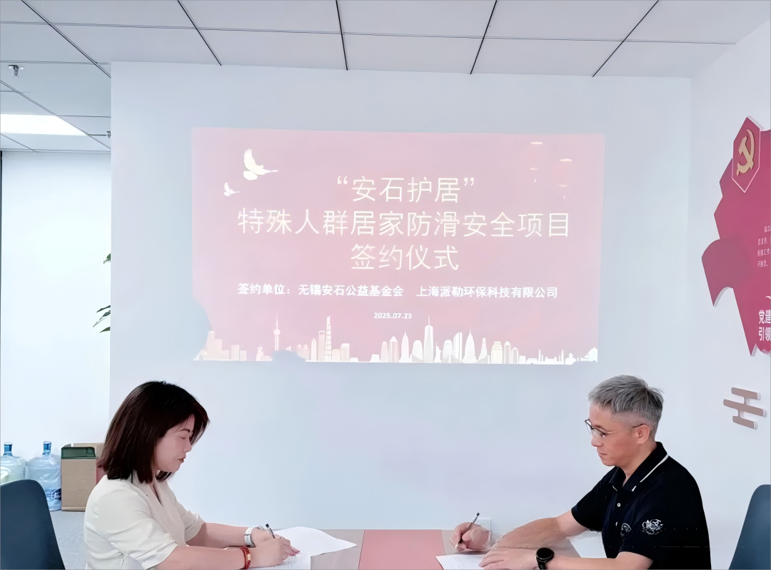 2025 年 7 月 23日, “安石护居”公益项目签约仪式在基金会办公室顺利举行,无锡安石公益基金会发起人之一全建国先生与上海派勒环保科技有限公司的总经理黄娅女士签署了捐赠协议。 此次合作中,上海派勒环保科技向基金会捐赠价值十万元的派勒防滑地垫,基金会为上海派勒环保科技颁发了荣誉证书,以表彰其对公益事业的大力支持。