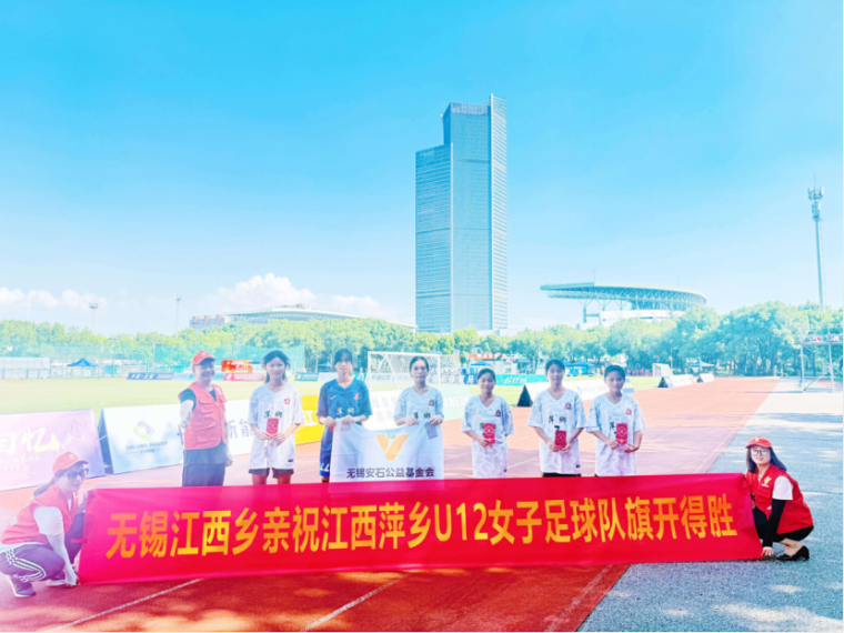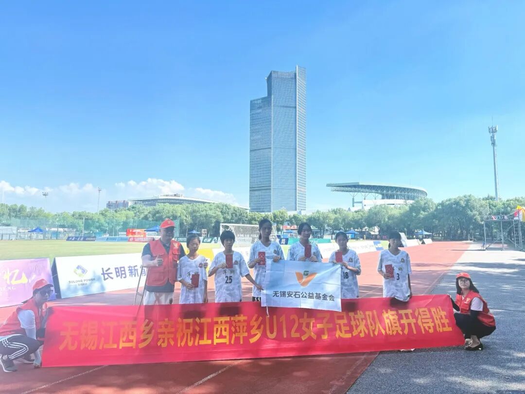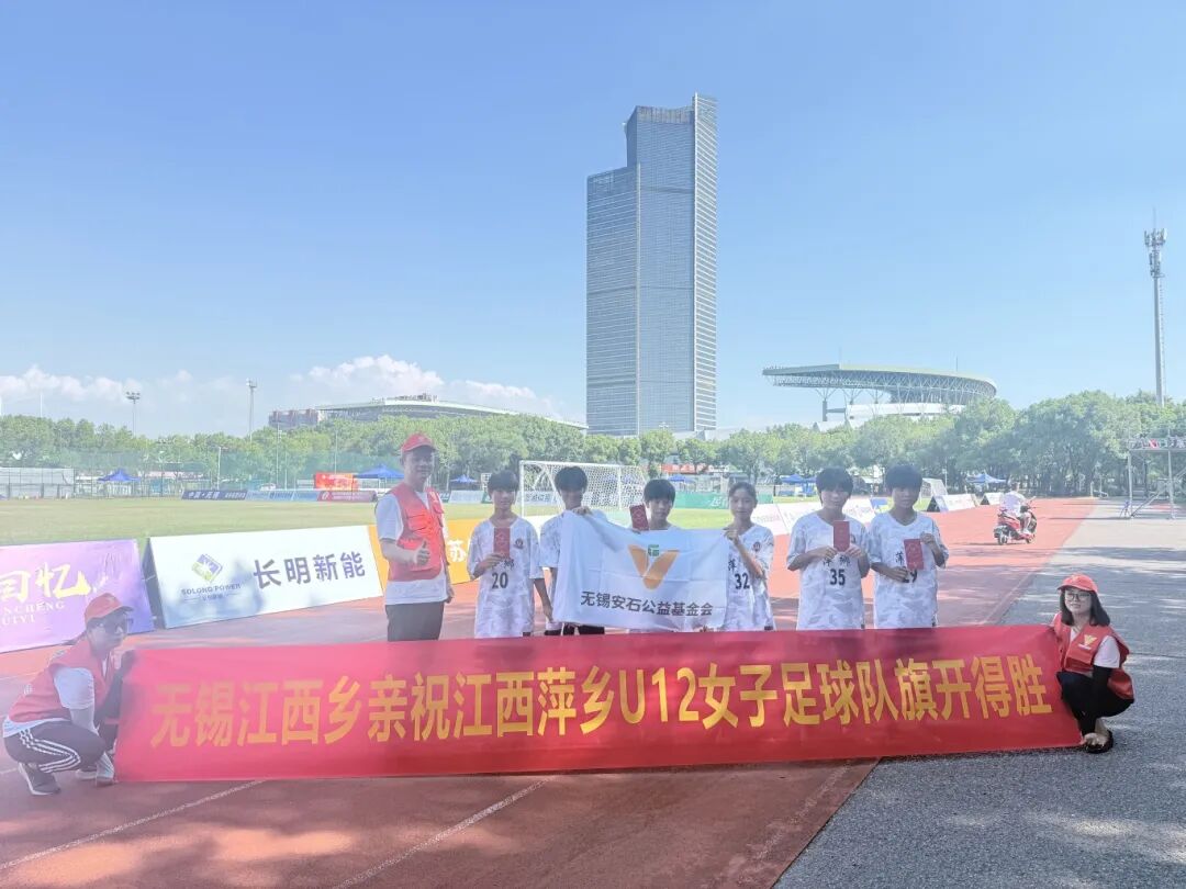 本场对决是江西萍乡队&深圳宝安队的晋级之争,为了给江西小将们坚实支持,无锡安石公益基金会第一时间行动起来,不仅细致筹备了各类后勤物资,还积极协助联络在锡的江西乡贤,组建起一支充满温情的助威团。比赛当天,大家身着基金会志愿者统一服饰,早早便守候在赛场边,只想用最实在的行动告诉孩子们:加油!家乡人就在身边!